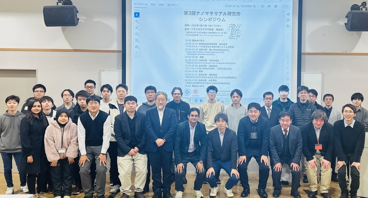 2026.01.22 お知らせ 第3回ナノマテリアル研究所シンポジウム~盛会のうちに終了いたしました 2026年1月21日(水) 、ITビジネスプラザ武蔵6F(金沢市) にて、第3回ナノマテリアル研究所シンポジウムを盛会のうちに終了いたしました。 ナノマテリアル関連分野における最先端の研究発表に対し、実験方法や技術に関する専門的な質疑応答をいただき、とても活気あふれるシンポジウムとなりました。 降雪の中、遠方からお越しいただいた講演者の皆様、そしてお集まりいただきました皆様、誠にありがとうございました。 PREV VIEW ALL